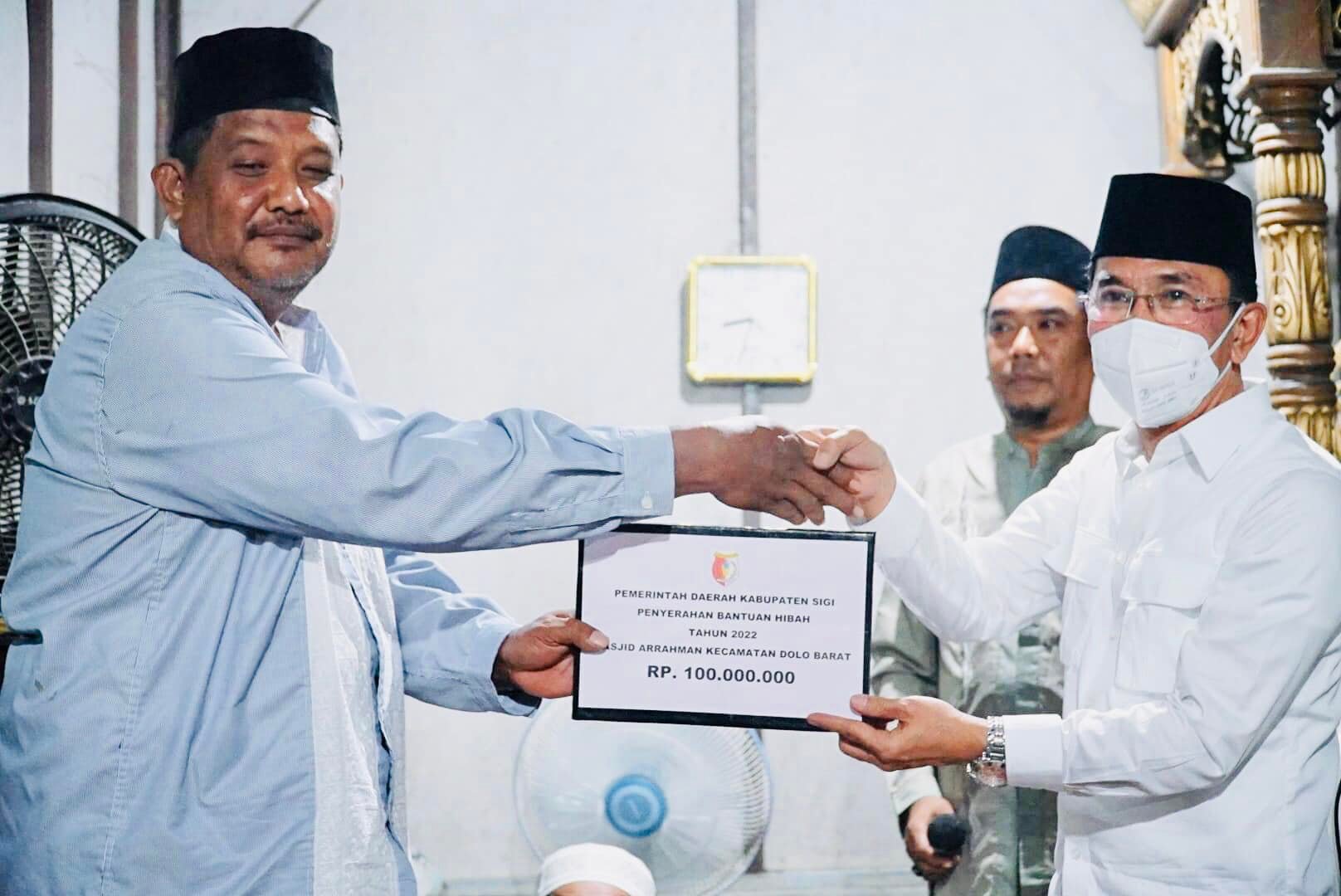 Dalam kesempatan tersebut Bupati Mohamad Irwan memberikan Bantuan dana hibah sebesar 100 juta Rupiah serta menyerahkan bingkasan kepada Imam Masjid dan Pegawai Sarah Masjid Ar-Rahman Desa Rarampadende Kecamatan Dolo Barat.