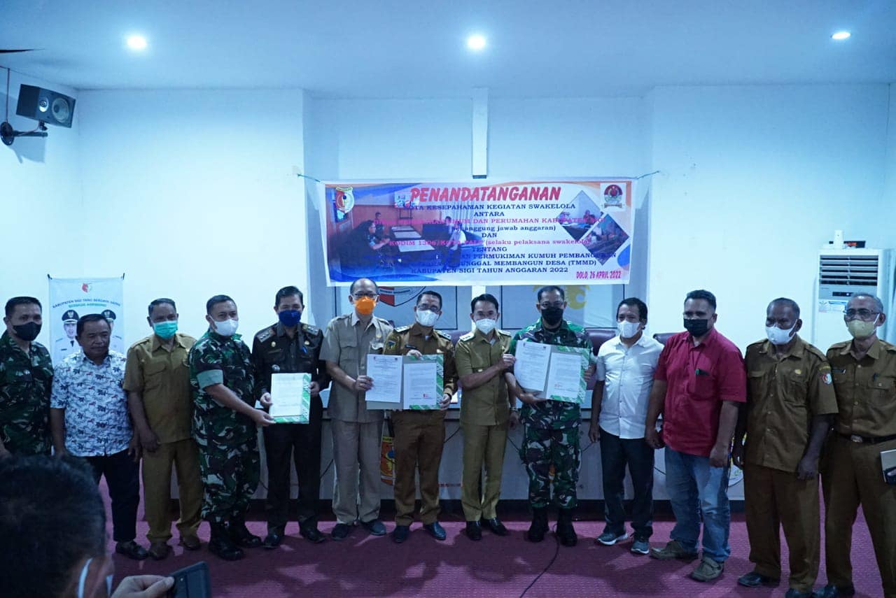SIGI – Bertempat di ruang Aula kantor Bupati Sigi, Mohamad Irwan, S.Sos., M.Si bersama Wakil Bupati Sigi, Dr. Samuel Yansen Pongi, SE., M.Si di dampingi Dandim 1306/Kota Palu Kolonel Inf Ari Suseno, S.Sos, dan Kepala Dinas Pekerjaan Umum dan perumahan mengikuti acara Pendatanganan Nota Kesepahaman Kerjasama Kegiatan Swakelola Pembangunan Rumah Baru Antara Dinas Pekerjaan Umum dan Perumahan Kabupaten Sigi. pada (Selasa, 26 April 2022).