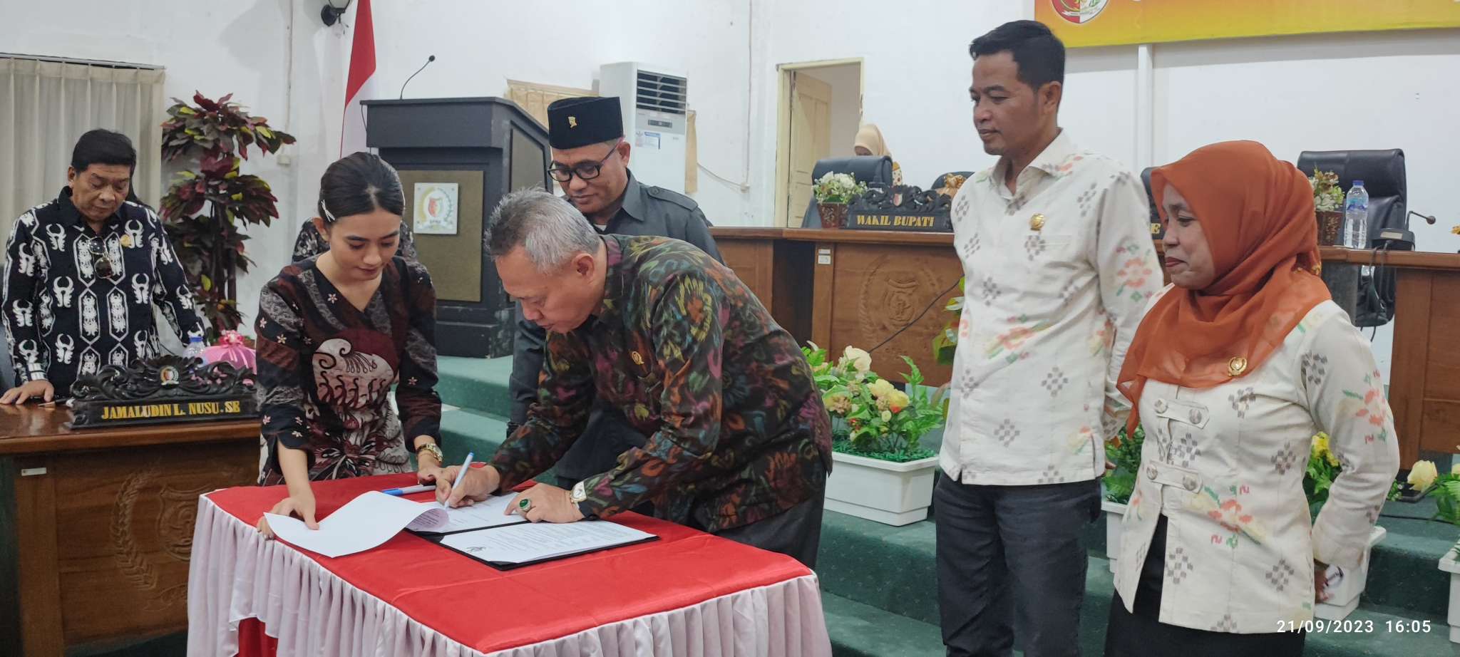 Diakhir rapat paripurna, Pimpinan DPRD Sigi bersama Wakil Bupati mewakili Bupati Sigi melakukan penandatanganan persetujuan bersama.(Mad)