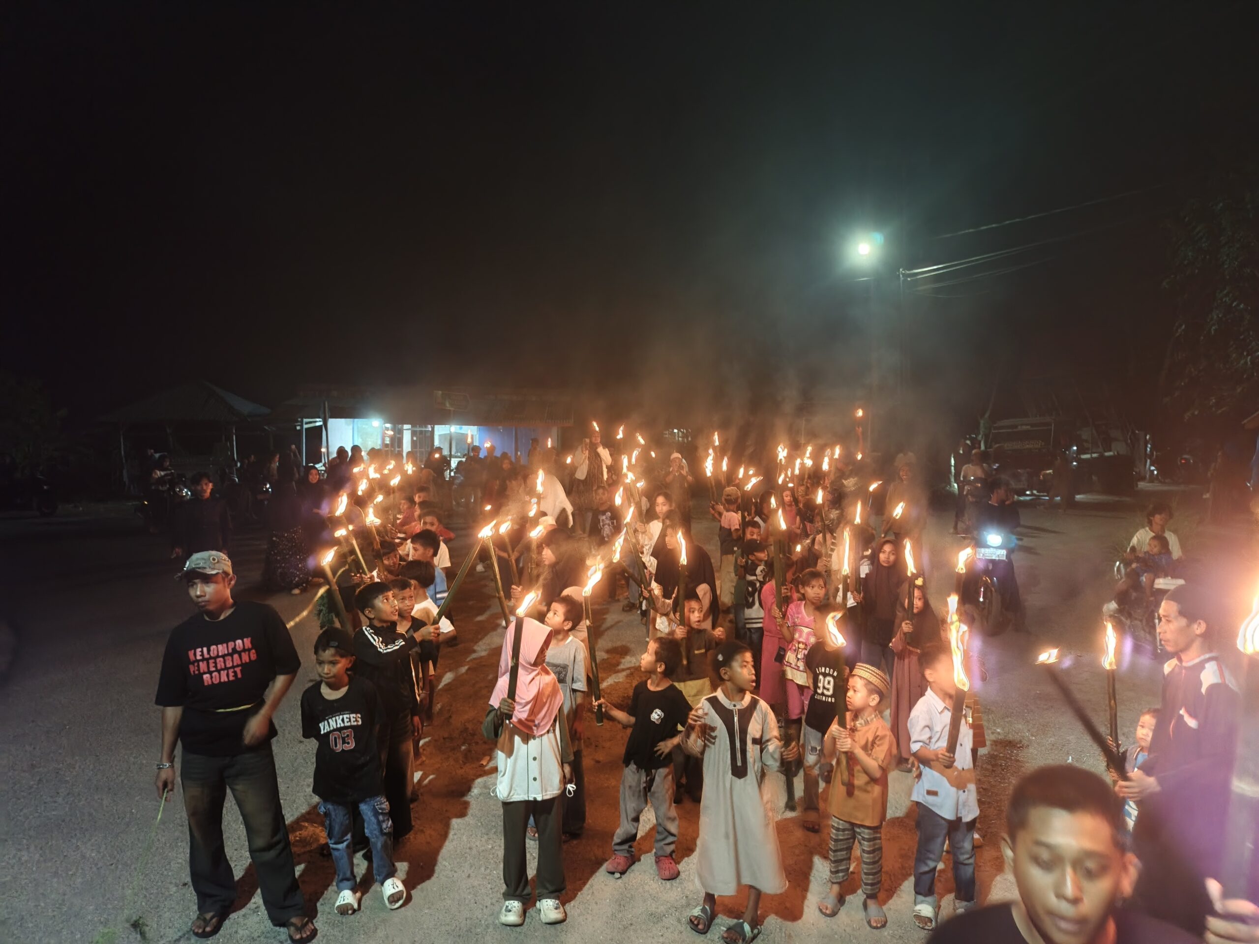 Pawai obor dimulai setelah salat Isya dan mengambil rute mengelilingi sejumlah ruas jalan utama desa. Ratusan peserta yang terdiri dari anak-anak, remaja, hingga orang tua tampak antusias membawa obor sambil melantunkan shalawat dan takbir, menciptakan suasana religius dan penuh kekhidmatan.